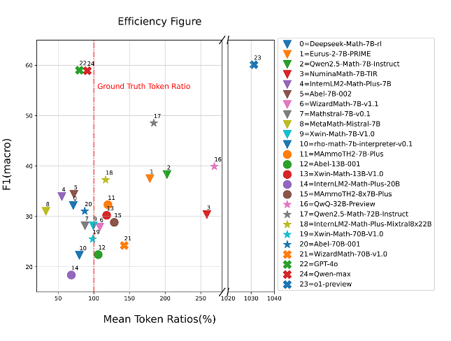 模型性能和 token 使用效率之间的关系是理解模型设计中 trade-offs 的关键因素。如图7所示,我们分析了平均 token 比率(%,由模型在推理过程中实际使用的令牌数除以基本真值答案中的令牌数计算得到),代表 token 使用相对于真实值的效率,与反映模型预测性能的 F1 分数之间的关系。