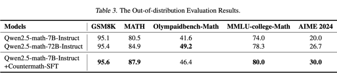 文章还提出了一种反例驱动的微调框架。研究人员从现有数据集中筛选出仅1025条包含反例证明的数据对模型进行微调。实验证明,这种小样本微调不仅显著提升了模型在COUNTERMATH上的判断准确性与反例生成能力,更在多个分布外(OOD)基准测试中,使7B参数量模型超越了72B参数量模型的性能,证明反例推理能有效增强大模型的通用数学概念理解与灵活推理能力。