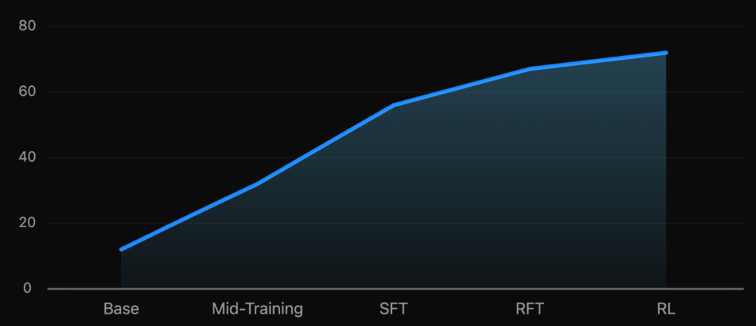 1. **Mid-Training:** 早期训练阶段着重强化了模型的工具使用、多轮交互、指令遵循、编码知识注入、Git Commit 数据处理以及通用思考能力,为后续阶段打下坚实基础。