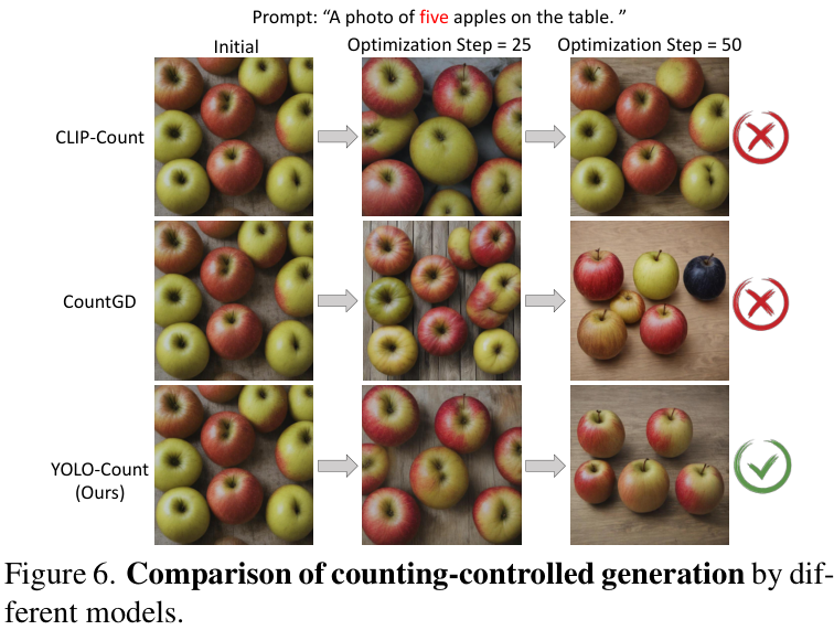 其次,YOLO-Count继承了YOLO-World架构的开放词汇能力,并实现了完全可微分。这意味着它不仅能对任意类别的对象进行计数,更关键的是,YOLO-Count计算出的计数误差能够通过梯度下降的方式,反向传播给文生图模型,从而在生成过程中实时“纠正”其行为,使其更精确地按指令生成指定数量的物体。