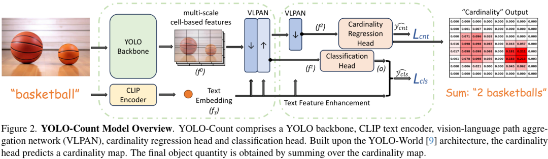 这是YOLO-Count最核心的贡献。研究者提出了一种新颖的回归目标——基数图。与传统密度图不同,基数图的每个网格单元(grid cell)直接回归一个[0, 1]之间的值,表示该单元“包含”一个对象的“分数”。将整个图的数值求和,便能得到总的对象数量。这种设计巧妙地解决了对象大小和空间分布变化带来的计数偏差问题,无论物体大小如何,每个物体都贡献大约为1的总和。