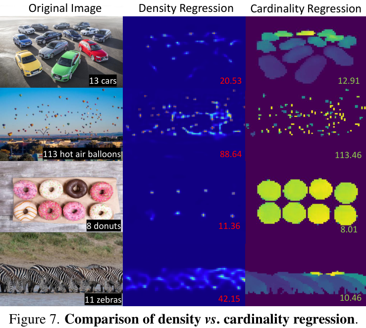 首先,研究者们引入了“基数图”(Cardinality Map)这一新颖的回归目标。与传统密度图不同,基数图的每个网格单元直接回归一个[0, 1]之间的值,代表该单元包含一个对象的“分数”。将整个图的数值求和,即可得到总的对象数量。这种设计巧妙地解决了对象大小和空间分布变化带来的计数偏差问题,确保无论物体大小,每个物体都贡献大约为1的总和。