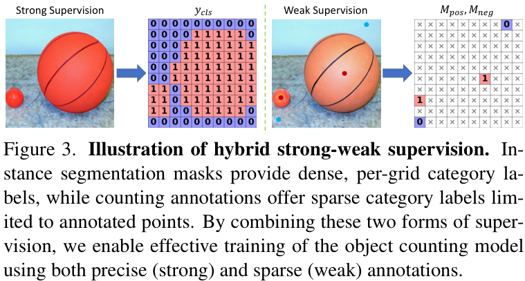 为了有效地训练模型,YOLO-Count采用了一种混合监督方案。它既可以利用带有精确分割掩码的“强”标注数据,也可以利用只有点标注或数量标注的“弱”标注数据。这大大扩展了可用训练数据的范围,提升了模型的泛化能力。