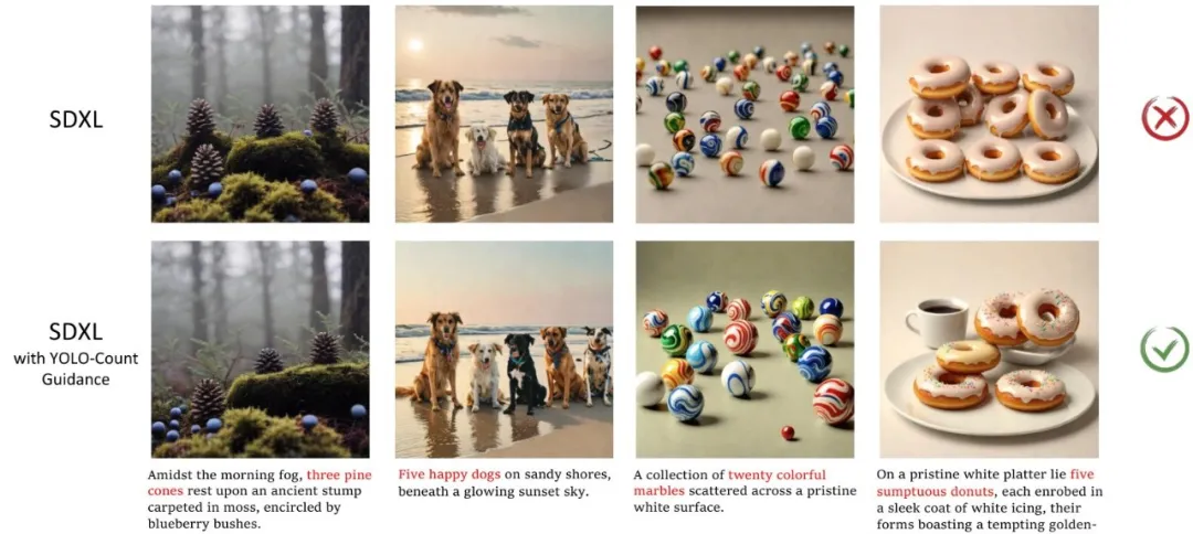 从定性结果来看,效果一目了然。当提示词要求“5个苹果”时,基线模型可能生成任意数量的苹果,而经过YOLO-Count指导后,模型能够稳定地生成5个苹果,且保持了高质量的图像效果。