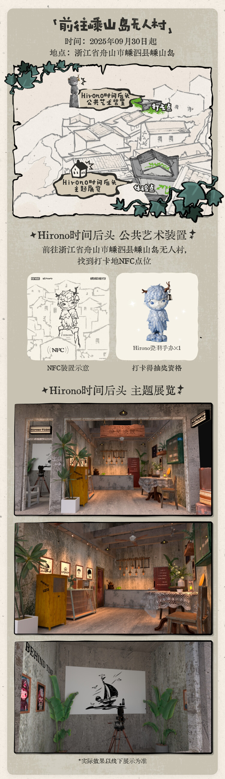 小野(Hirono)作为泡泡玛特旗下独树一帜的IP角色,是疗愈与安慰的象征,这与嵊山岛无人村的气质不谋而合。