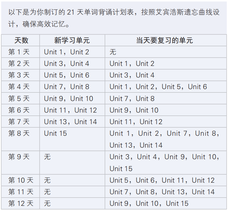 例如,你可以在 DeepSeek 中输入:“我要在21 天内背 15 个单元的单词,每个单元约含 100 个单词,我计划每天新学习 2 个单元左右,每个单元都是在学习之后的第 1、2、4、8、15天进行复习。帮我生成一份单词复习计划,请列出一张表格,第一列表示天数,第二列表示新学习单元,第三列表示当天要复习的单元。”