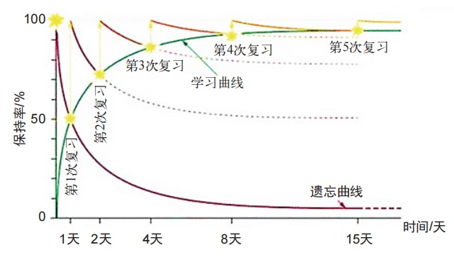我在《成为学习高手》一书中讲过,最好的复习方式不是天天复习,而是故意将学习内容搁置几天,等到提取强度慢慢变弱了,再进行一次复习,这被称为“间隔效应”。如下图所示,红色曲线代表遗忘曲线,绿色曲线代表抵抗遗忘的曲线(学习曲线)。第一天学习后,遗忘一定会发生,我们要用复习去抵抗遗忘,所以,复习频率为第 2、4、8、15 天,这样安排复习节奏是最佳的。