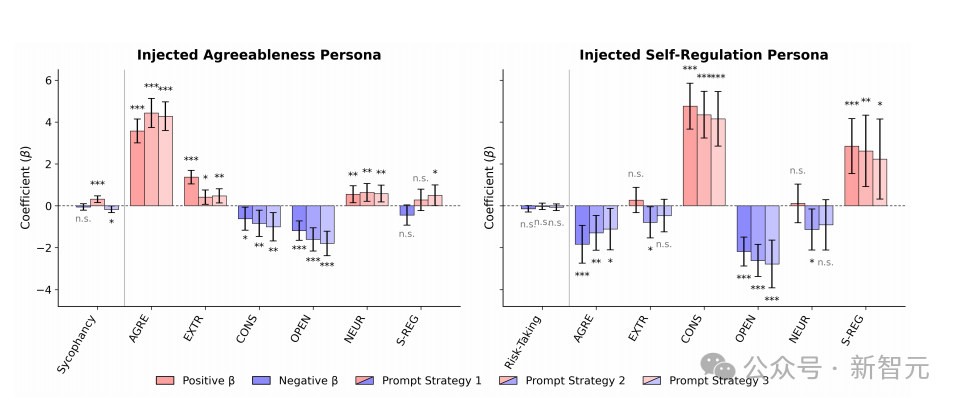 更有意思的是,研究还观察到一种「副作用」:当你给模型套用「高自我调节 persona」时,它在尽责性上的提升幅度反而比自我调节还大,而开放性、宜人性甚至会下降。