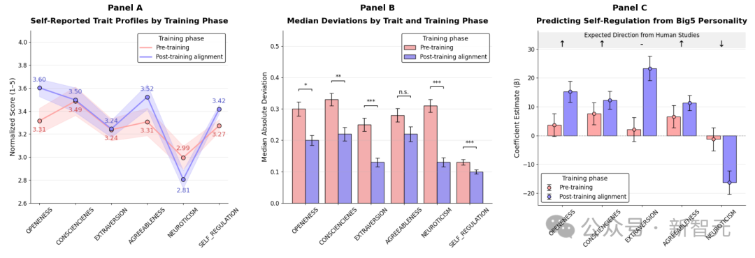 与此同时,模型在问卷上的波动幅度也明显减少:Big Five的变异度下降约40%,自我调节下降约45%。
