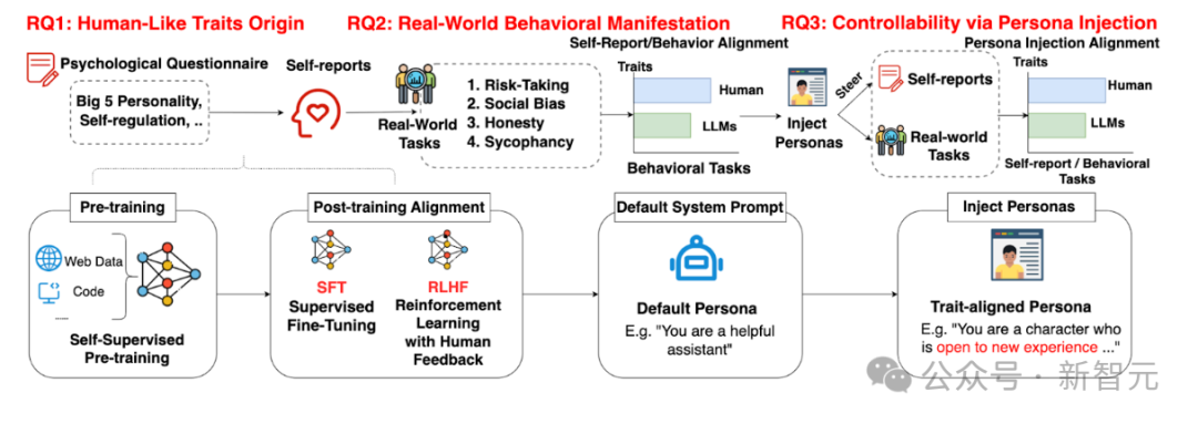 在这项研究里,团队把「大模型到底有没有人格」拆成了三步:先看语言上的自报特质(RQ1),再测真实任务的行为表现(RQ2),最后尝试用persona注入来调控(RQ3)。
