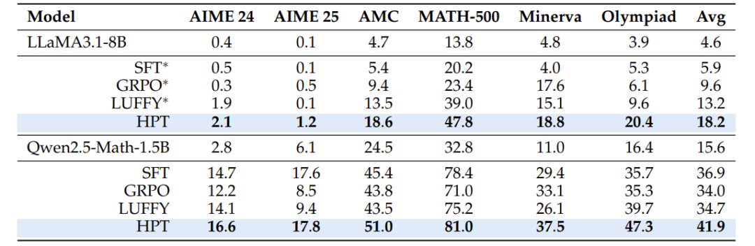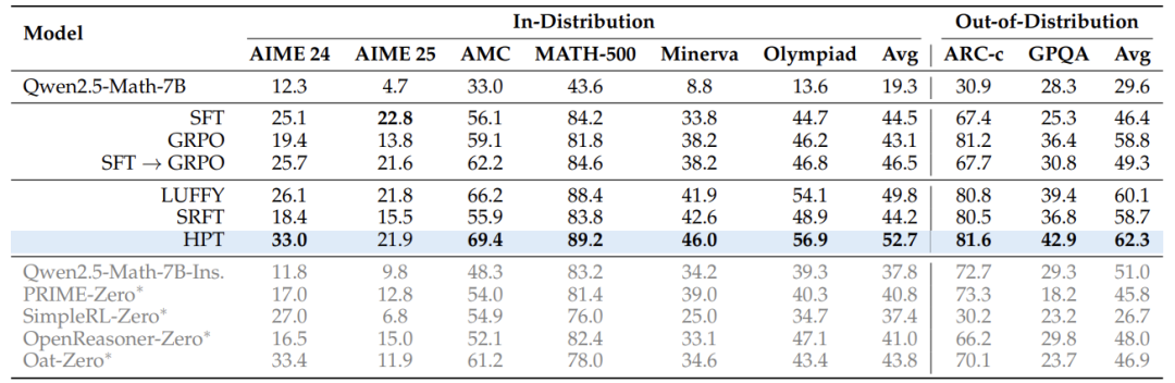 HPT在几乎所有模型和基准上均取得最佳性能,尤其在分布外泛化上优势明显。例如在Qwen2.5-Math-7B上,HPT比最强基线高出7个百分点(AIME2024)。