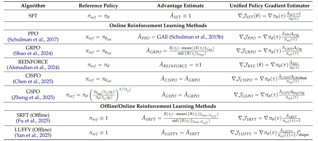 调整不同token的重要性权重。SFT中使用当前策略 ,鼓励模型关注预测概率低的token;PPO中使用旧策略 ,控制更新幅度;离线RL中常设 ,简化计算但引入偏差。