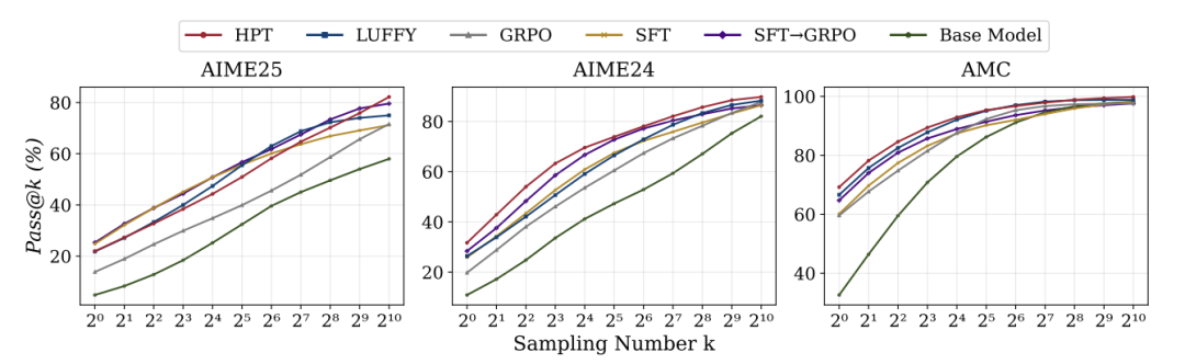 探索能力:HPT的Pass@1024显著高于纯RL方法,说明它既提升了性能上限,又保持了探索多样性。