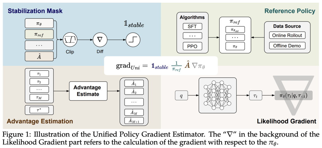 清华大学等团队的开创性论文《Towards a Unified View of Large Language Model Post-Training》首次从理论层面统一了SFT和RL的优化目标。他们提出了“统一策略梯度估计器”(UPGE),揭示了SFT、PPO、GRPO等多种训练方法本质上都是对同一目标函数在不同数据分布假设下的梯度估计。UPGE通过稳定性掩码、参考策略分母、优势估计和似然梯度这四大核心组件,实现了不同训练策略在梯度层面的统一,并阐明了它们在**偏差与方差权衡**上的固有差异。