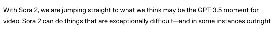在介绍文章中,OpenAI 更是直言 Sora2 直接进入了视频领域的 GPT 3.5 时刻,也就是当时的 ChatGPT 时刻。