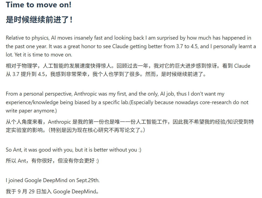 根据姚顺宇在博客上发表的文章得知,他于 9 月 19 日从 Anthropic 正式离职,9 月 29 日加入 Google DeepMind。