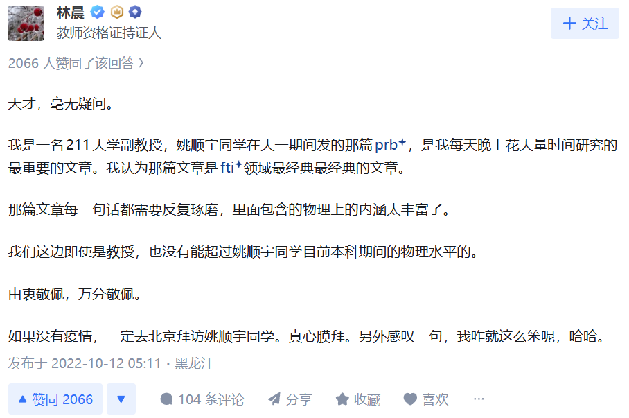 其在物理学研究上的卓越成就让一位 211 大学副教授也不禁感叹:「我们这边即使是教授,也没有能超过姚顺宇同学目前本科期间的物理水平的。」