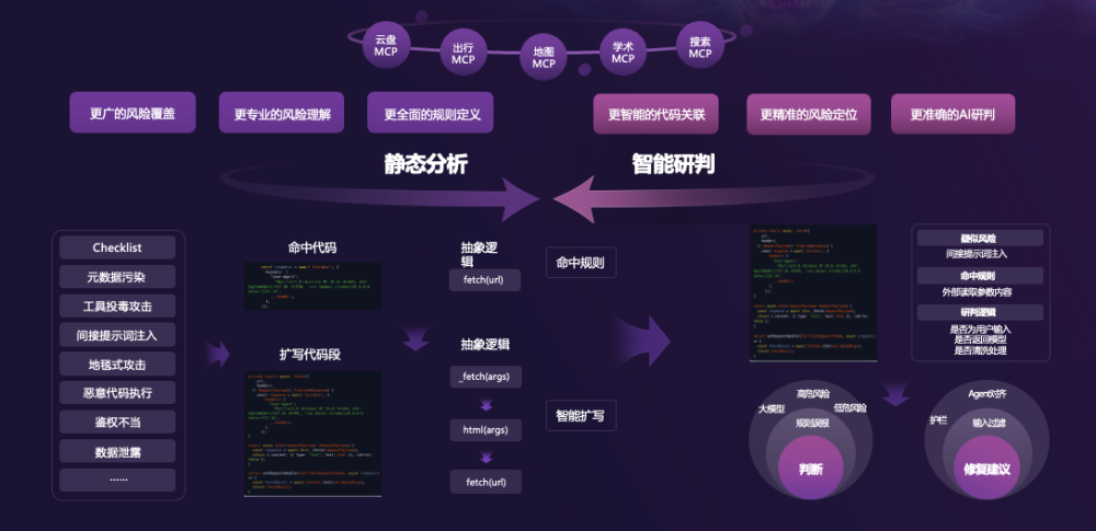 MCP开放生态带来安全挑战。MCPScan开源框架结合静态分析与LLM智能推理,为Agent工具提供系统性安全体检,有效发现并防范命令劫持与提示注入等风险。