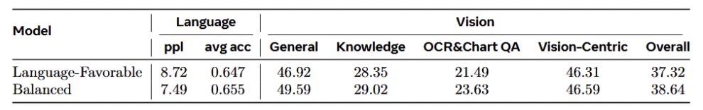 基于这些发现,研究团队进一步调配出了一套最优的数据混合方案,即“平衡配方”。该配方富含推理内容,并配以适量的视觉世界知识,可用于在语言预训练阶段就为模型注入强大的视觉先验。实验结果表明,按此配方训练出的模型在语言能力上与专门优化语言任务的模型持平或更优,同时在所有视觉基准测试中全面超越。