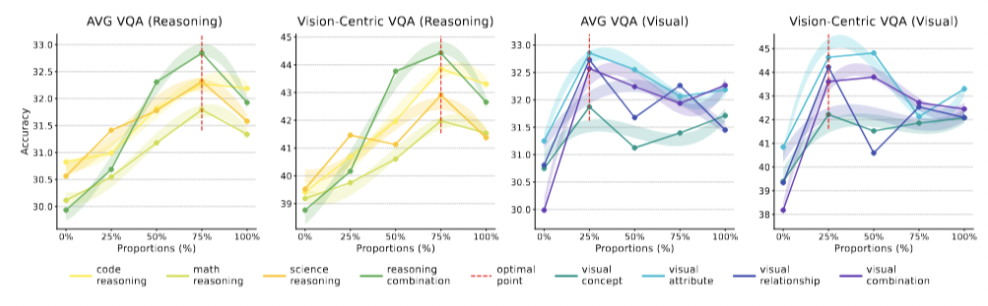研究通过一系列精巧的实验证实了这些发现。他们发现,在预训练数据中,持续增加推理密集型文本(如代码)的比例,模型的下游视觉推理能力会显著提升,甚至能达到75%的占比。 与之形成对比的是,描述视觉世界的文本虽然重要,但其效果会迅速饱和,少量即可打下基础。