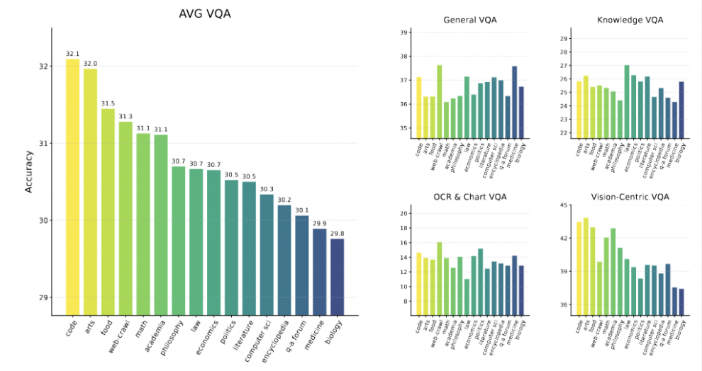 能力的起源有迹可循:通过对 16 种不同单一数据源的独立训练,研究发现,在「代码」「数学」和「学术」数据上训练的模型,在需要抽象推理的视觉任务(Vision-Centric VQA)上表现最好。