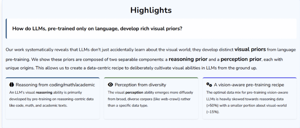 这项研究不仅解释了 LLM 无师自通学会看的秘密,更提出了一套预训练的数据配方,旨在从语言预训练阶段就有意地培养模型的视觉能力,为下一代更强大的多模态大模型铺平道路。