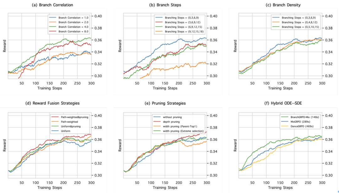 从消融实验可以看到:适中的分支相关度、早期更密集的分裂能加快奖励提升;路径加权的奖励融合让训练更稳;深度剪枝带来最佳最终效果;而混合 ODE–SDE 调度则在保持稳定的同时达到最快训练速度。