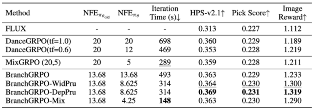 为避免树形结构可能带来的指数级成本,BranchGRPO还设计了两种「剪枝」策略:宽度剪枝只保留关键叶子节点参与反向传播,深度剪枝则跳过部分层的反传,进一步压缩开销。这一系列精巧的设计使得BranchGRPO在效率和稳定性之间取得了完美的平衡。