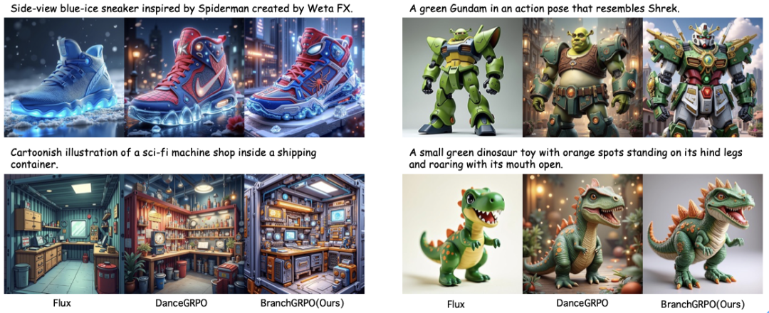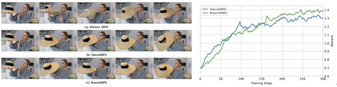 不使用 RLHF 的基础模型常出现严重的闪烁和变形;DanceGRPO 虽有所改善,但画面依旧模糊、不够稳定。相比之下,BranchGRPO 生成的视频帧更锐利,细节更丰富,角色和物体在时间维度上保持一致,真正实现了「流畅不掉帧」的观感。