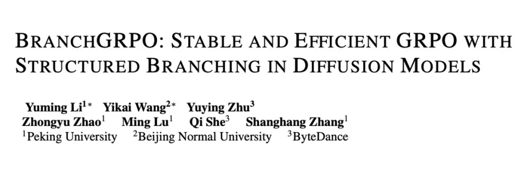 @article{li2025branchgrpo, title={BranchGRPO: Stable and Efficient GRPO with Structured Branching in Diffusion Models}, author={Li, Yuming and Wang, Yikai and Zhu, Yuying and Zhao, Zhongyu and Lu, Ming and She, Qi and Zhang, Shanghang}, journal={arXiv preprint arXiv:2509.06040}, year={2025}}