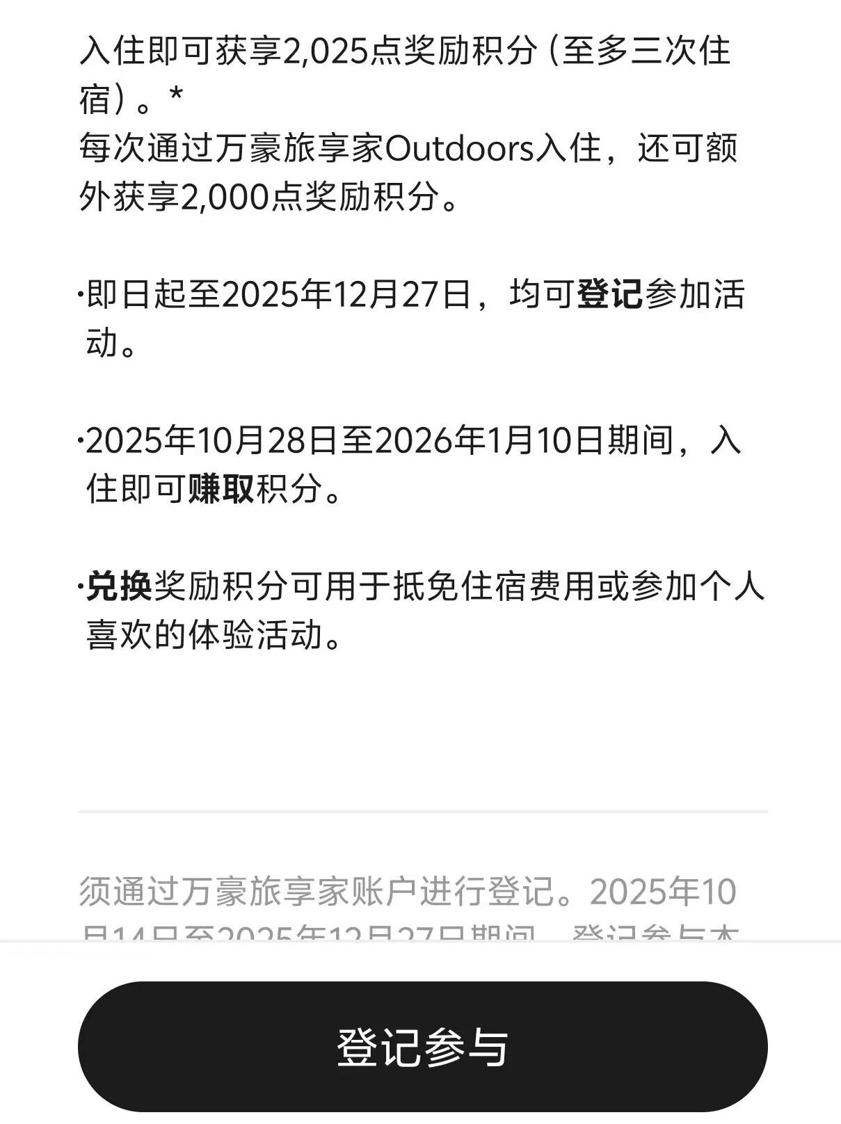 万豪旅享家最新季度活动已揭晓。会员需在2025年12月27日前注册,入住时间范围为2025年10月28日至2026年1月10日。本次活动的核心奖励是每次入住可获得2025积分,最多累积3次。此外,针对万豪新推出的“Outdoors”户外主题酒店板块,每次入住可额外获得2000奖励积分,该部分积分无上限。目前国内有9家酒店符合“Outdoors”标准,包括长白山、崇礼、峨眉山、阳朔和贵州的部分酒店。文章指出,单纯从积分奖励来看,本次活动的力度普遍被认为较为平淡,甚至不如许多定向优惠。对于大多数会员而言,预计能享受到的福利主要是三次入住的共计6075积分。户外主题酒店的额外积分是本次活动的一个特色,但其适用范围相对有限。