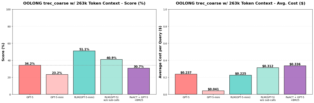 结果很惊人:在能获取到的最难的长上下文评测集之一 OOLONG 上,使用 GPT-5-mini 的 RLM 正确答案数量是直接使用 GPT-5 的两倍以上,而且平均每次调用的成本更低。