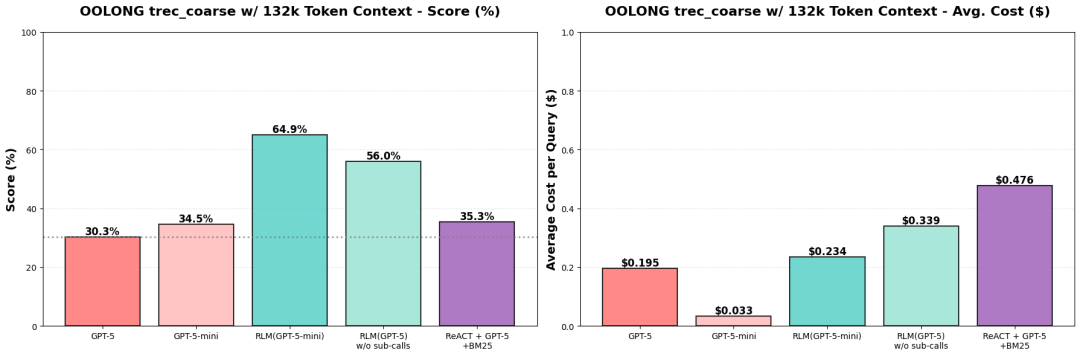 RLM (GPT-5-mini) 比 GPT-5 高出 15 分以上(约 49% 的提升),并且平均每个查询的成本更低。