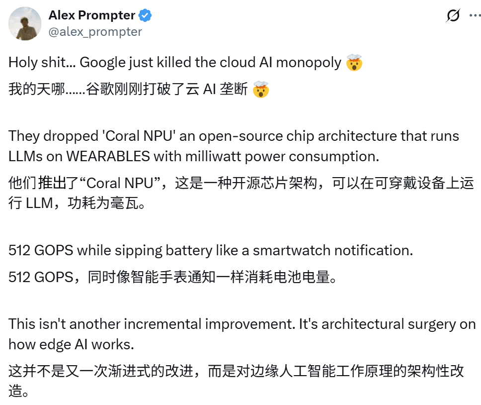 这种双重关注意味着 Coral NPU 有望成为首个开放、基于标准、专为将大语言模型 (LLM) 引入可穿戴设备而设计的低功耗 NPU。