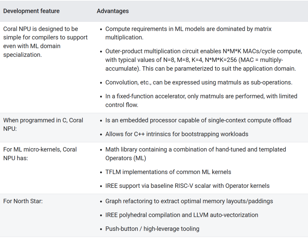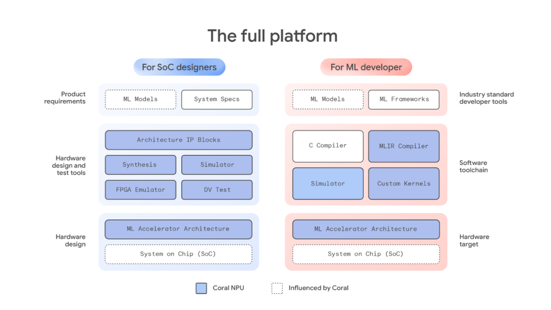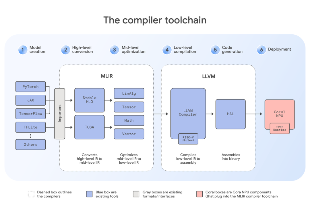 Coral NPU 包含一个全面的软件工具链,其中包括针对 TensorFlow 的 TFLM 编译器等专用解决方案,以及一个通用的 MLIR 编译器、C 编译器、自定义内核和一个模拟器。这可为开发者提供了灵活的路径。