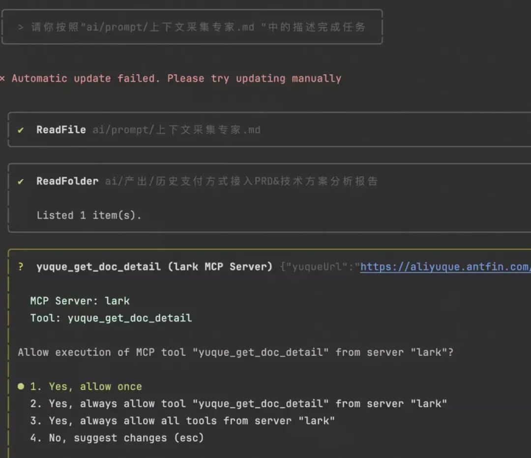 3. **工具能力封装**:赋予AI操作真实系统的权限(如读取文档、分析Git记录、查询/推送配置),并严格限制工具使用,要求完整工具名调用,并引入用户确认环节保障安全。