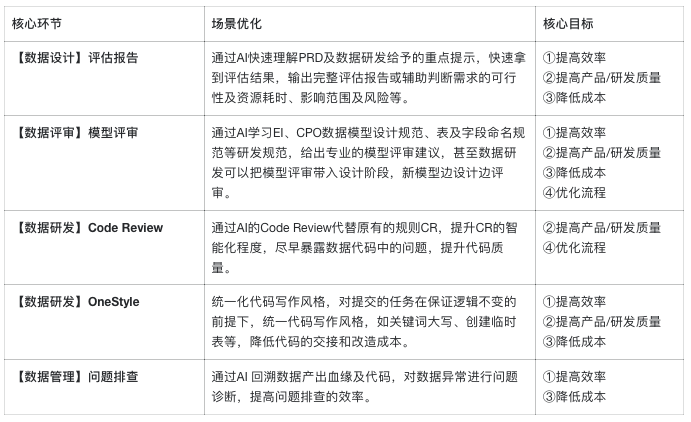 在以上这些丰富的能力加持下,我们希望构建一个面向数据研发全链路的智能Agent,通过AI能力去帮助【评估设计】->【模型评审】->【数据研发】->【数据运维】四大核心环节实现提效,把数据研发同学最耗时、执行效率低或者效果较差的五个场景作为先行切入点:
