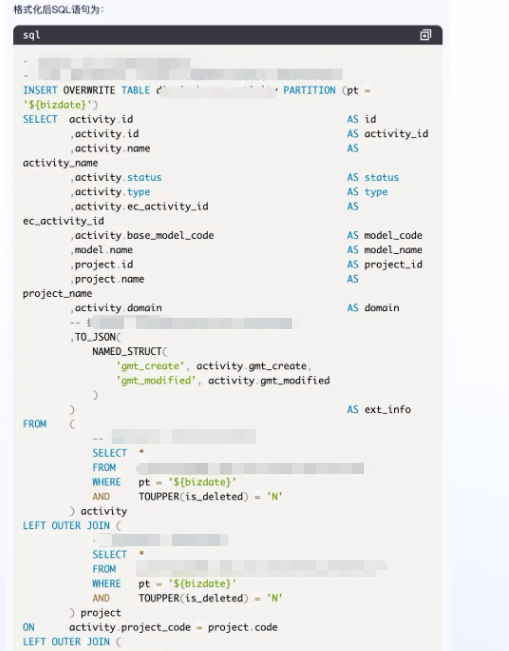 小D的模型重构完了,他通知下游同学修改下依赖,下游同学打开自己负责的任务一看...这是什么历史代码连基本对齐都没有,根本看不懂,想一键格式化,结果发现d2上的格式化真的就只是一键对齐,好像帮我改了又好像没啥效果...... 许多规范性的代码问题根本无法解决:比如 代码无注释、超长加工逻辑、多层WITH嵌套等等,严重影响到工作中的协作开发效率......