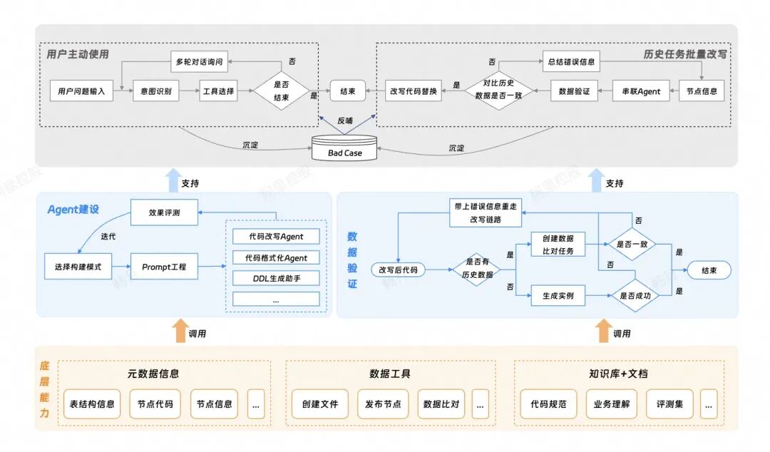 AI Agent的构建基于模型(LLM作为‘大脑’)、工具(外部函数作为‘手脚’)和指令(行为指南)三大核心组件,并致力于攻克数据链路影响范围精准定位、多业务域模型规范适配、代码规范与基模能力匹配以及元数据驱动代码改写等关键难题。