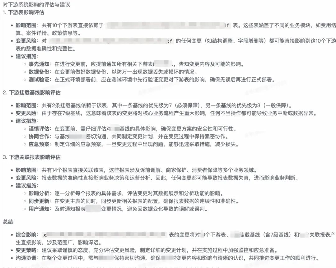 基于这个通用型Agent,在【问题排查】场景中,我们只需要调用该Agent来帮我们查出异常字段/表的各上游节点,并根据字段血缘深度,由大模型帮我们梳理出相关字段的加工逻辑,从而辅助我们的口径答疑。