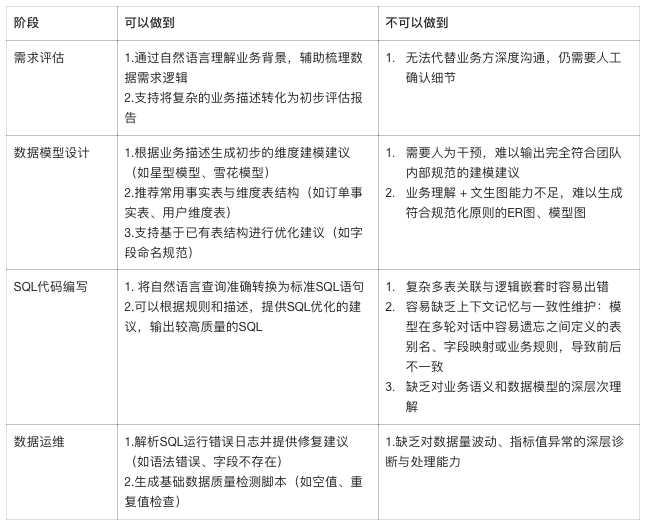 进入正题,在应对新的数据需求时,我们通常遵循 需求评估-模型设计-SQL开发-测试发布-数据质量运维 的多阶段协作流程。值得注意的是,这些环节并非线性推进,而是与日常研发工作深度融合。就像小D,在运维过程中发现问题,需及时启动影响范围评估及迭代修复等保障机制,确保线上数据的准确性,也因此带来了连锁反应导致大量额外工作。正是这样的复杂情况下,我们意识到AI技术的价值:通过自动化工具与智能决策辅助,帮助我们从低效重复的ROI泥潭中突围,实现从“研发提效”到“技能跃迁、能力提升”的跨越,推动我们自身与业务价值的双重增长。