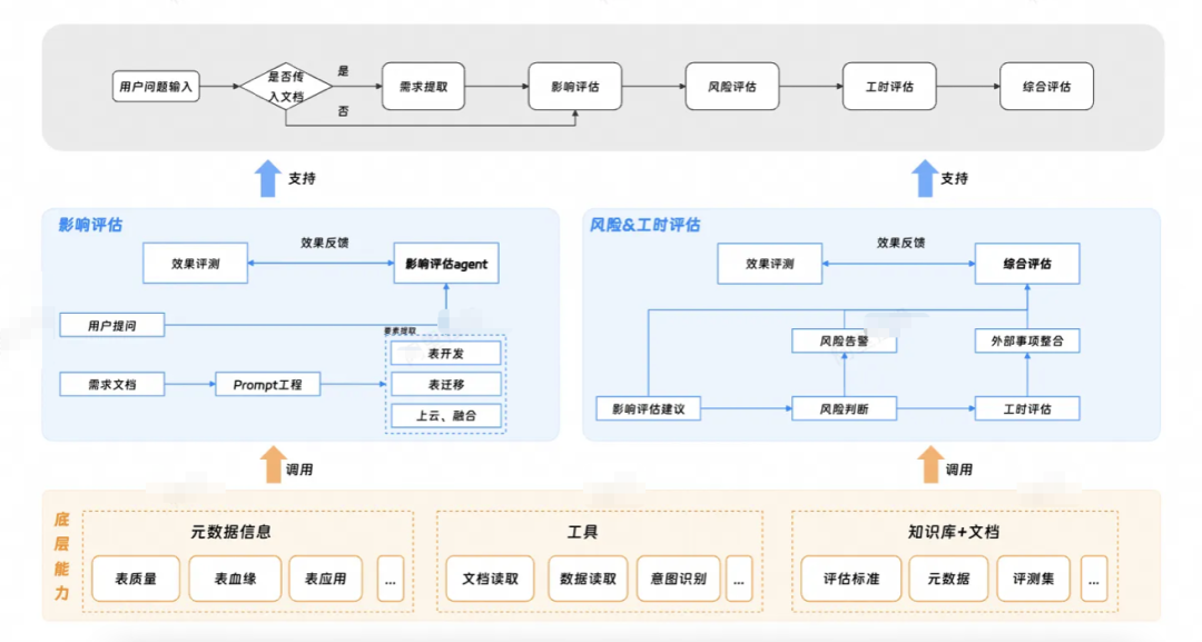 按照设想,我们首先需要从需求文档中提取到要做评估的内容(表),当然也可以接受用户直给的提问。接下来,「影响评估」帮助同学做表血缘信息、质量信息、生产信息、应用信息一体化的盘点&评估;然后交由「风险评估」帮助判断下其中是否里面存在一些隐含的风险需要注意;最后「工时评估」像是个简易版的数字人告诉同学,你做完这个需求大概需要多少工期,最近还有哪些事排着呢。