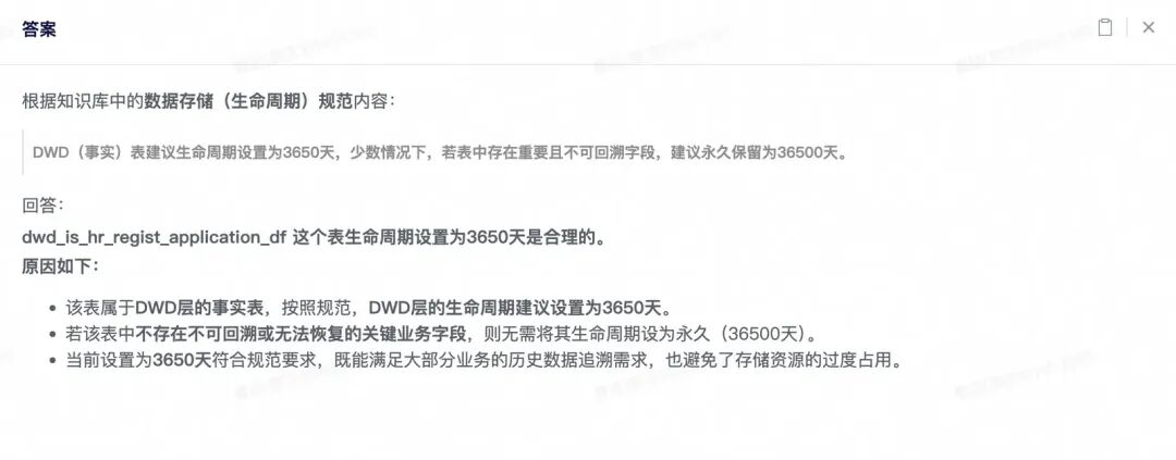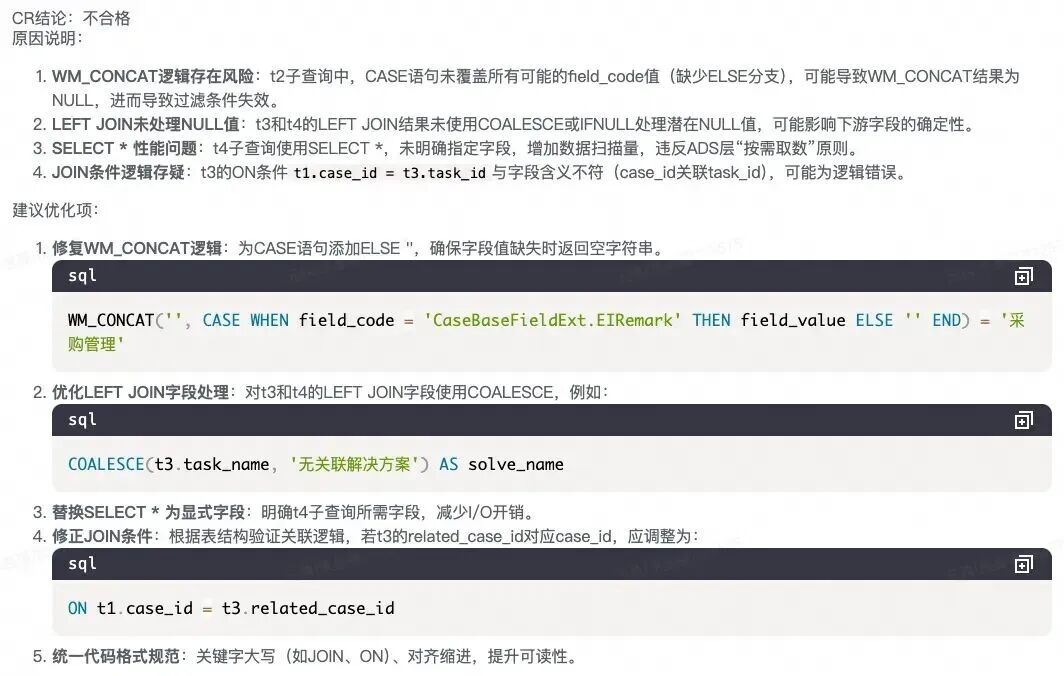 1)首先是代码规范检查,目标很明确,确保SQL代码符合团队规范(语法、命名、注释、格式等),这里我们只需要依托强大的基座模型 + 私有知识库即可实现,多次调整Prompt后即可实现标准化的输出。私有知识库部分是完全可以依托【模型评审】场景的积累,快速复用的。