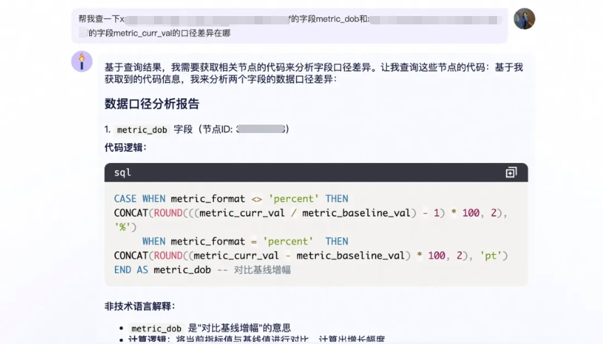 数据诊断:Agent帮我们完成找代码、理解代码、溯源并整理输出的工作,从代码层面直接告诉我们数据的计算口径是什么(不直接查表,减少数据安全风险),减少我们人工扒代码,花时间查口径、理解数据的人力成本。