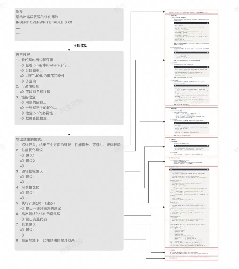 4)代码优化建议方向其实同方向3一样,基模已经很强大,结合RAG和Output形式的调整,即可做的较为优秀。从下图的case可以看出,在使用Qwen3-32B的基模情况下,即便未做太多Prompt的约束就能输出一份很完整的SQL优化建议报告,虽然有些优化点存在幻想,不过稍微做一些Prompt的调整即可输出更好的结果。