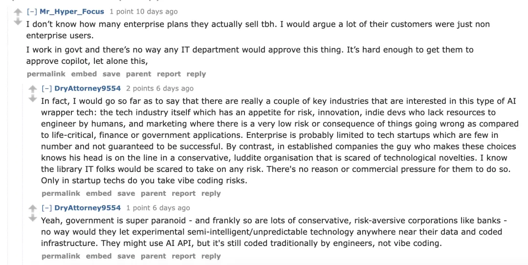 3、文章里提到,像Augment Code这类AI编码助手想进企业市场很难,因为企业批准Copilot都一言难尽。大家觉得阻碍AI编码工具在企业中普及的主要原因是什么?除了成本和安全性,还有别的考量吗?
