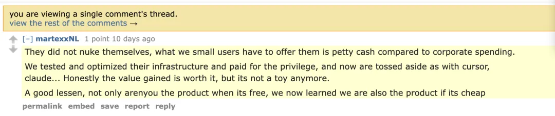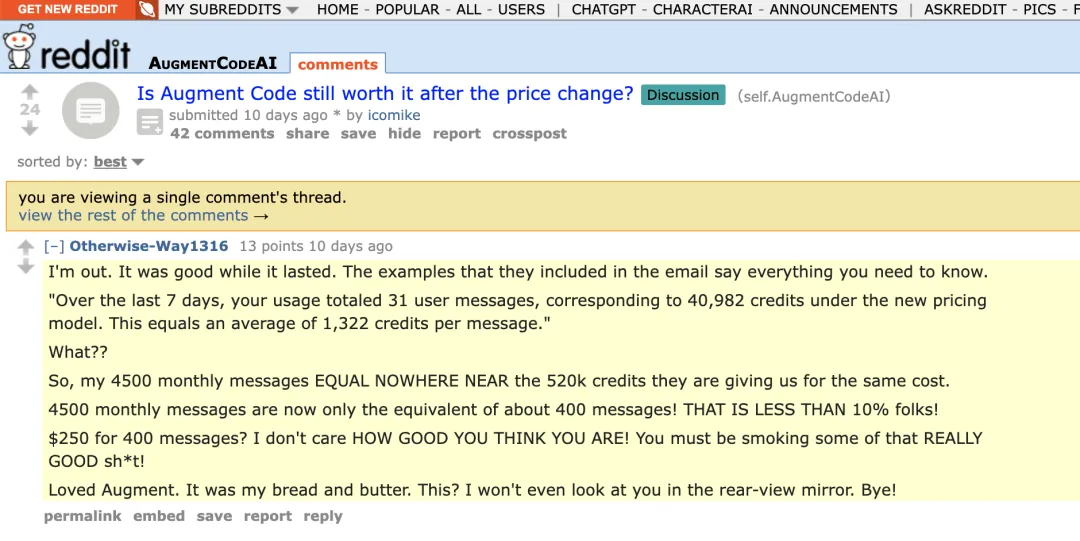 另有用户质疑,Augment 是利用早期用户完善系统后,再通过涨价将他们排除在外。“我们为测试和优化他们的基础设施出了力,还为此付了钱,现在却被一脚踢开。”
