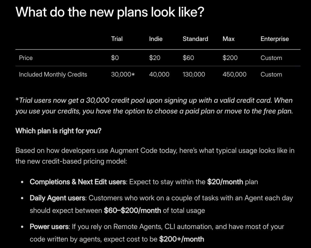 10 月 16 日,据外媒消息,AI 代码助手 Augment Code 已更新其定价模式,不再以消息交互次数为依据,而是改为按 AI 使用量计费。该公司表示原定价模式 “不具备可持续性”,但有用户计算后发现,新定价模式下成本上涨了 10 倍以上。