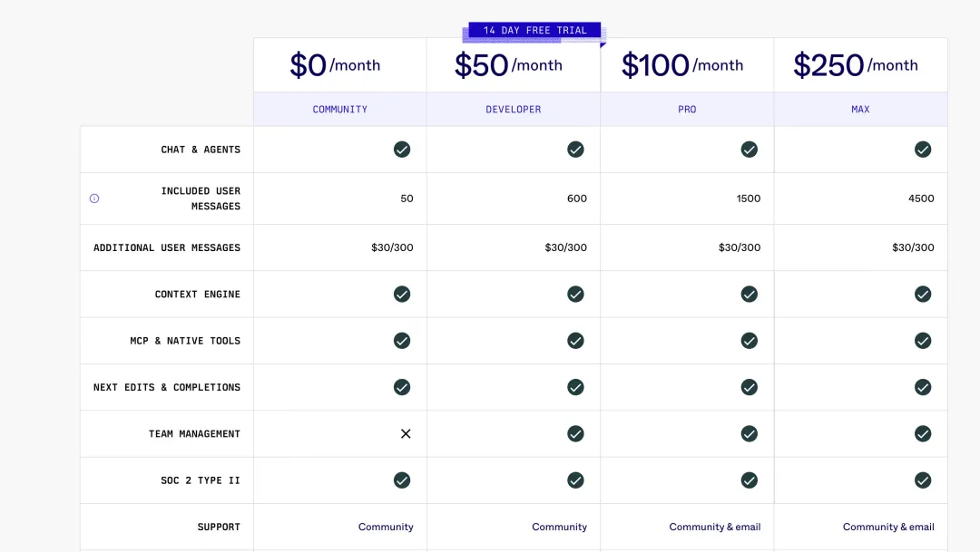当时就有一名开发者抱怨:“现在的价格比 Cursor 和 Windsurf 两款工具的费用加起来还高。” 此后,免费版直接下架,取而代之的是 “独立开发者版”:每月 20 美元,仅包含 125 条消息额度。