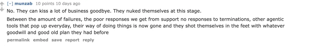 “且不说产品问题频发、客服部门的回应始终敷衍,就连用户提出终止合同也毫无反馈;再加上如今各类 AI 代理工具层出不穷、选择越来越多 —— 种种因素叠加下,他们先前积累的所有好感、以及旧套餐攒下的口碑,全都被自己如今的操作毁得一干二净,简直是搬起石头砸自己的脚。”